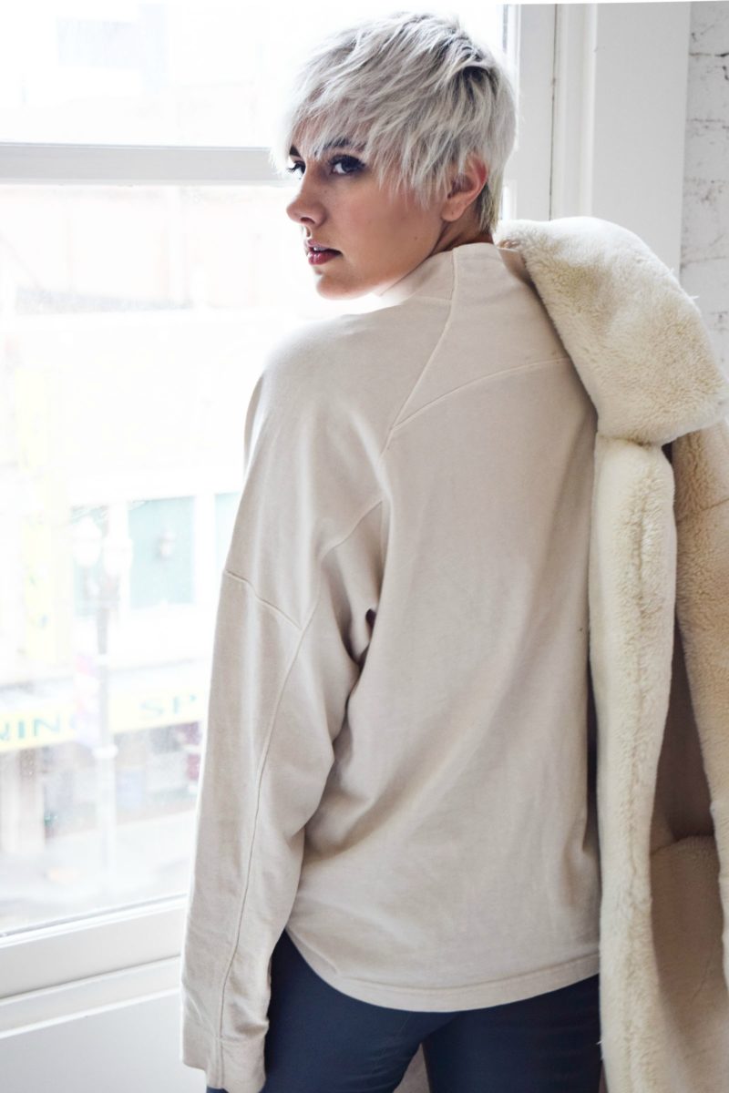 I love contrasting textures so for today’s look I’m wearing a pair of H&M navy faux leather trousers. The rest of today’s look I kept tonal to be a more subtle compliment to my fluffy outerwear. These Steve Madden white boots have been some of my most worn this winter and the turtleneck was a keepsake from New York that is actually a menswear item. Check it out if you are feeling adventurous.