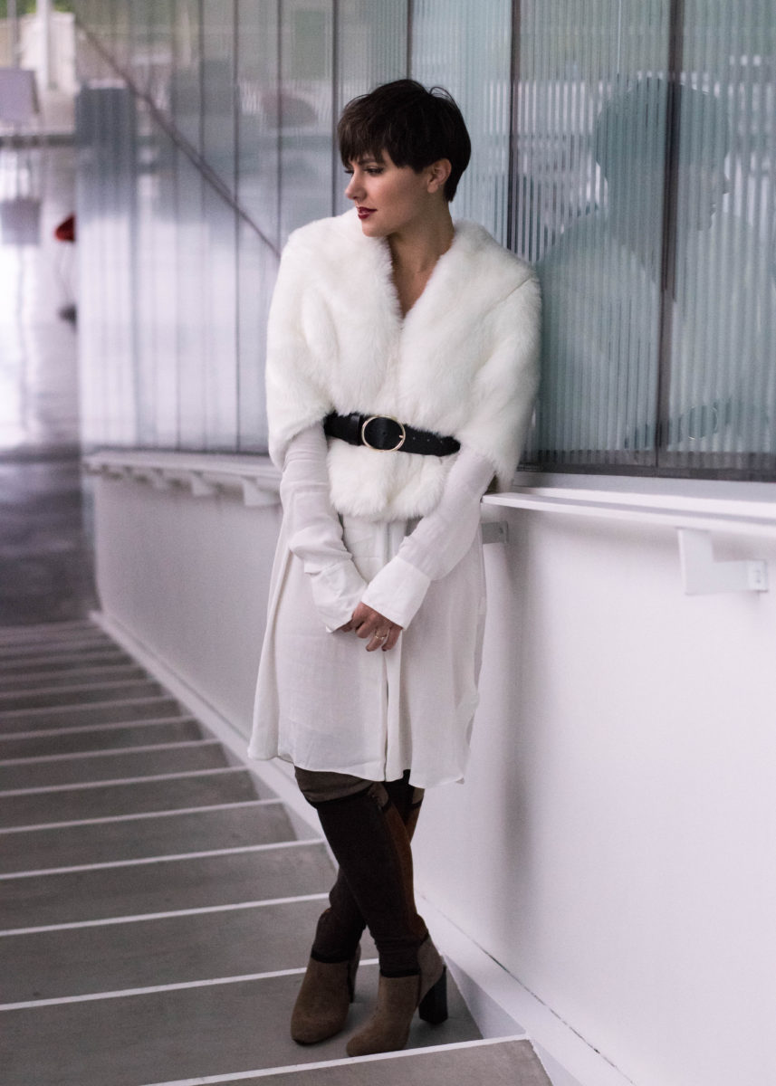 First, this look started with this white faux fur stole I had in my closet. It seems like we all have something like this be it in a more cape version like mine or even in a thicker scarf due to how trendy faux fur has been in recent years. Rather than simply wearing it as intended, I belted the stole to make it look like more of a part of the dress itself.