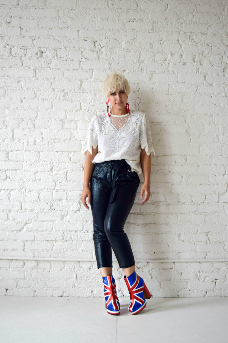Our first alter ego is the Rocker. This 80’s girl is a bit more monochromatic yet covered in vinyl and sequins. The color palette isn’t in your face but the accessories and textures are creating an outfit that is ready to shut the house down and take an encore.