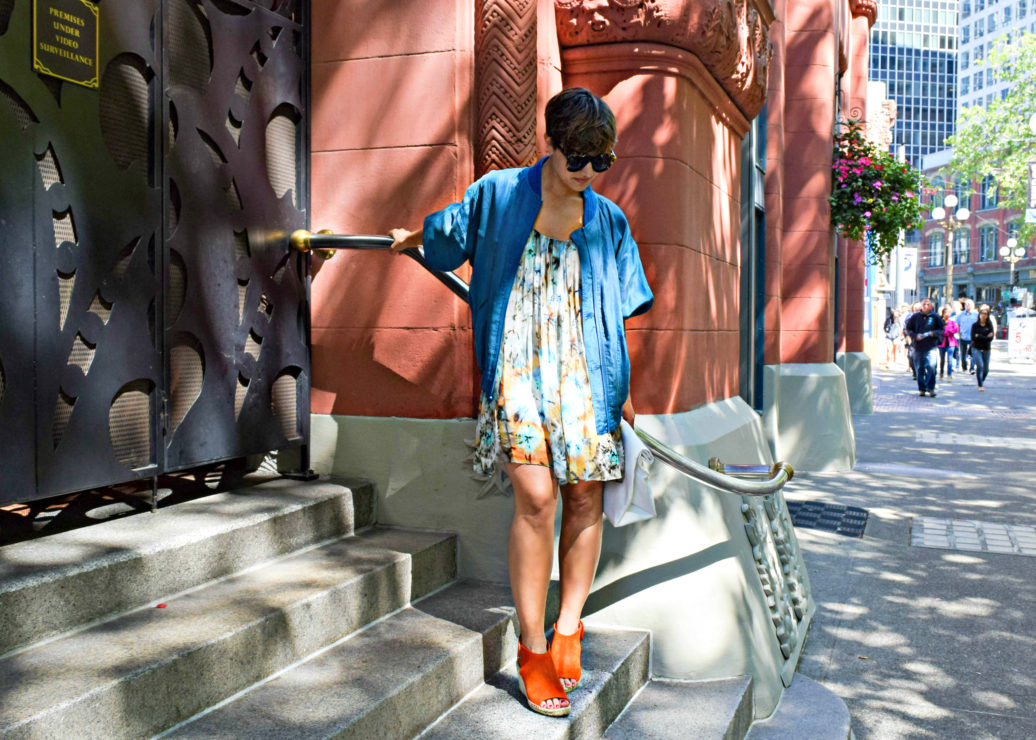 To provide structure to the look and another modern touch I added a vintage silk bomber that has a very borrowed from the boys vibe to it (it is Vintage Men’s Dior) which nicely contrasts with the flowing femininity of the dress. Keeping with Altuzarra’s dessert, ocean and fire-filled color palette I chose to highlight the print in the dress by adding a pop of orange through these Celine wedges. By pairing coordinate pieces that match the colors in the dress it emphasizes the gorgeous print and makes the colors even more noticeable and eye catching.